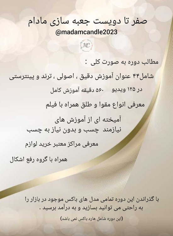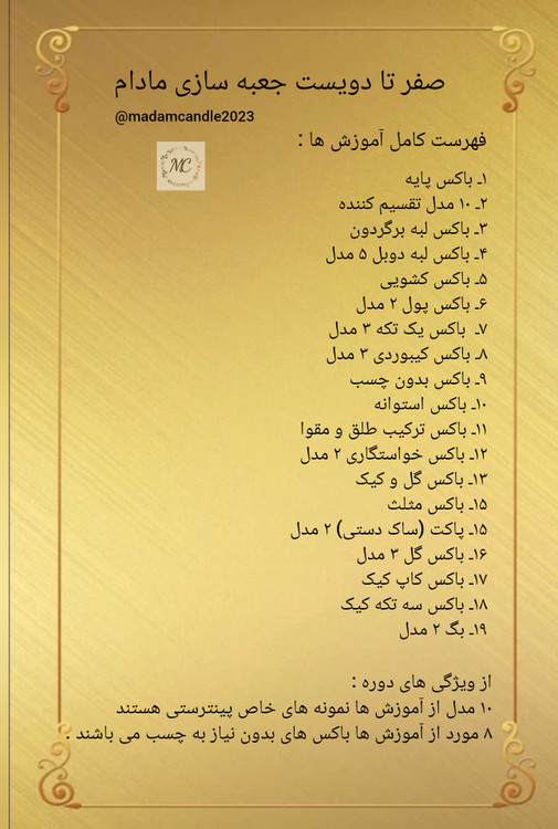 برای رسیدن به درامد در جعبه سازی که بازار بسیار خوبی دارد قطعا نیاز به اموزش اصولی دقیق و میلیمتری دارید که تنوع به روز و کارایی نیز داشته باشد دوره صفر تا دویست جعبه سازی مادام راهی بسیار مطمئن و همراه با گروه پاسخگویی برای رفع اشکالات احتمالی در این حرفه می باشد کسب و کار جعبه سازی با توجه به نیاز مشاغل متعدد و مناسبت های زیاد مانند خواستگاری ، قنادی ، دفاع دانشجویی ، هدیه پول و گل و طلا که نیاز به باکس دارند بسیار پرفروش می باشد .
