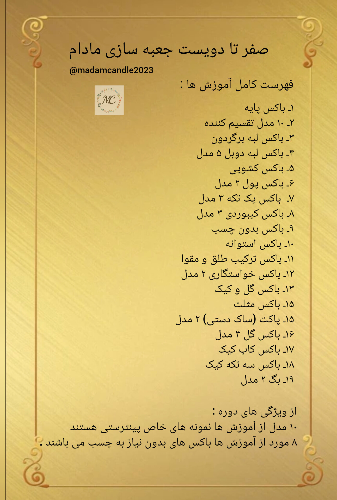 دوره بسیار کامل شامل ریزترین نکات جهت بالا بودن کیفیت کار ساخته شده ، تنوع مدل های اموزش تا پرکاربرد بودن و ترند بودن و جعبه های با چسب و بدون چسب